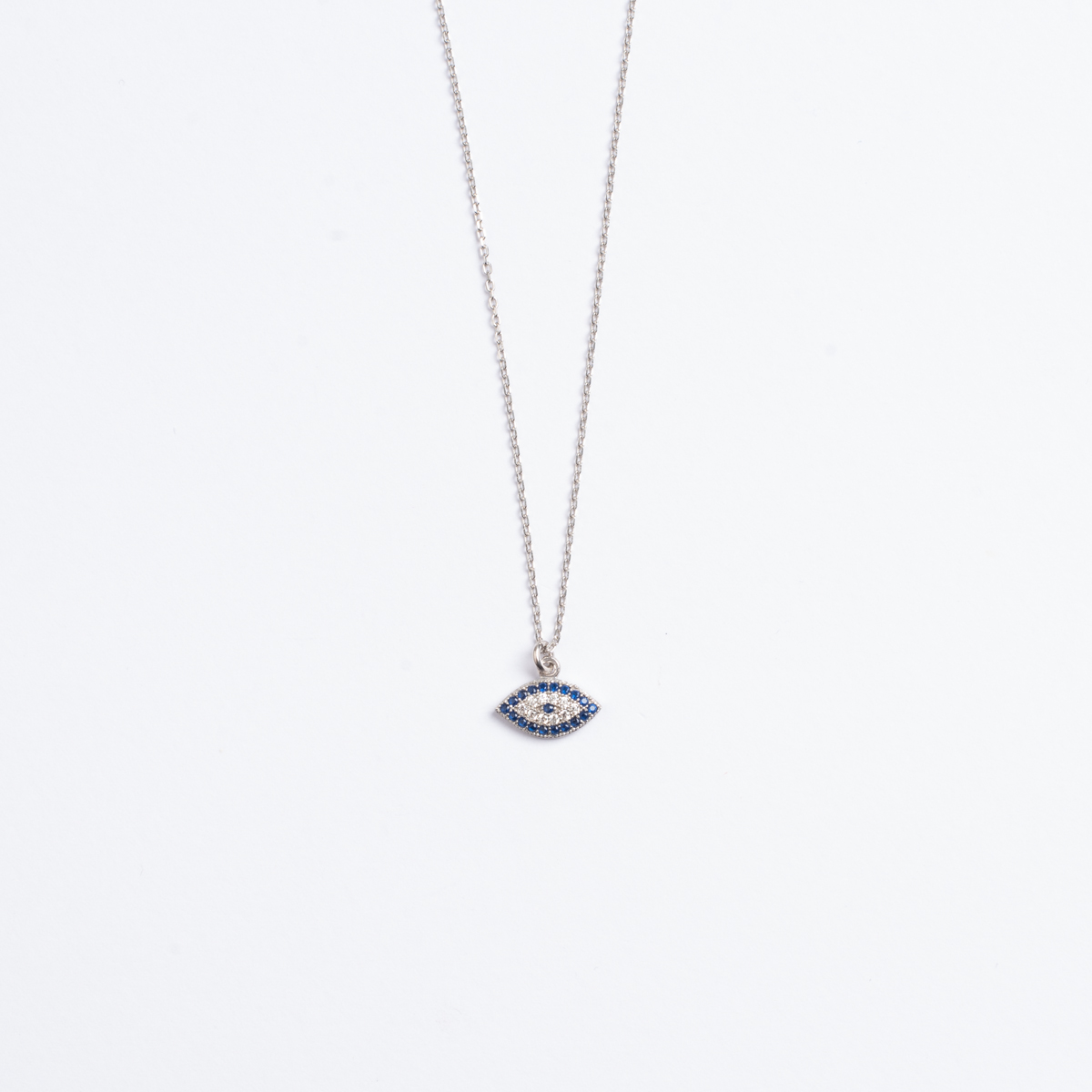 Κολιέ ματάκι με αλυσίδα σε λευκό ασήμι 925 με λευκά και μπλε ζιργκόν