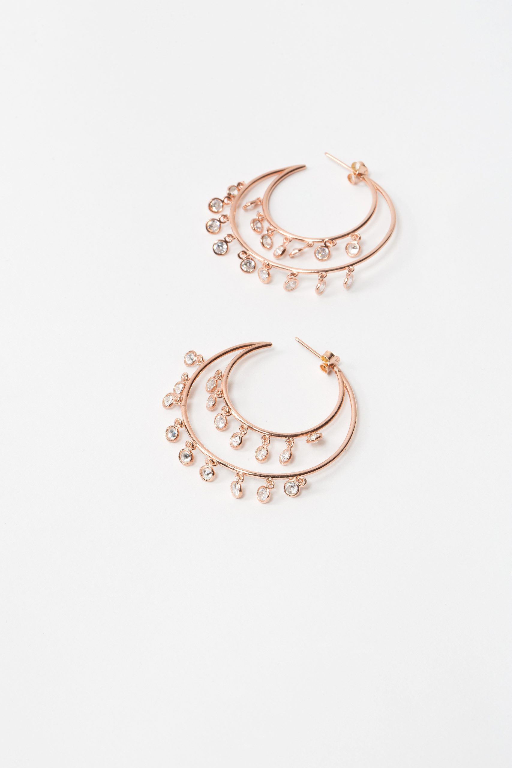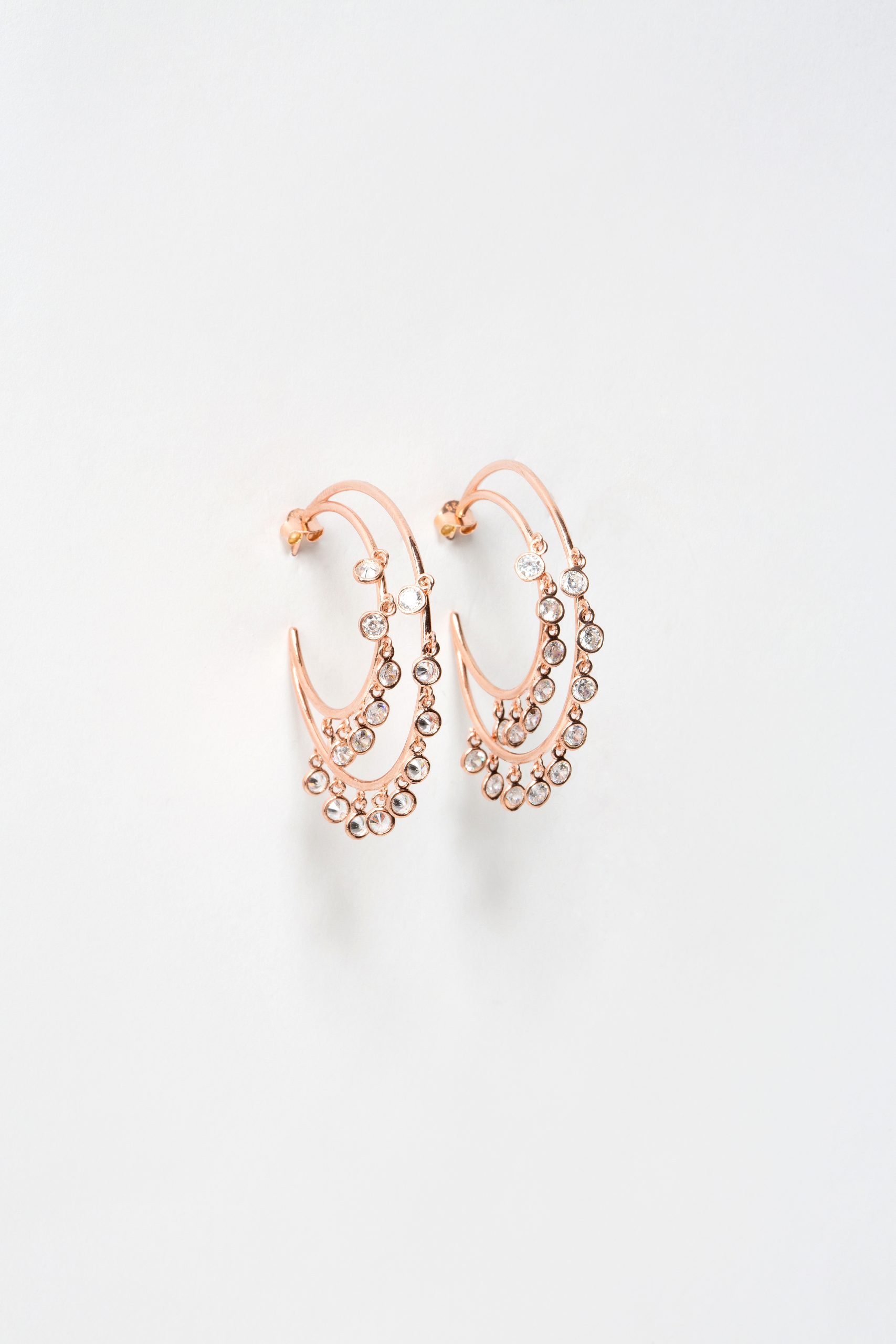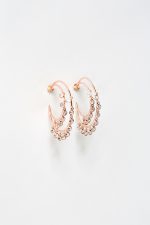 Σκουλαρίκια κρίκοι διπλοί σε ροζ επιχρυσωμένο ασήμι 925 με λευκά ζιργκόν που κρέμονται