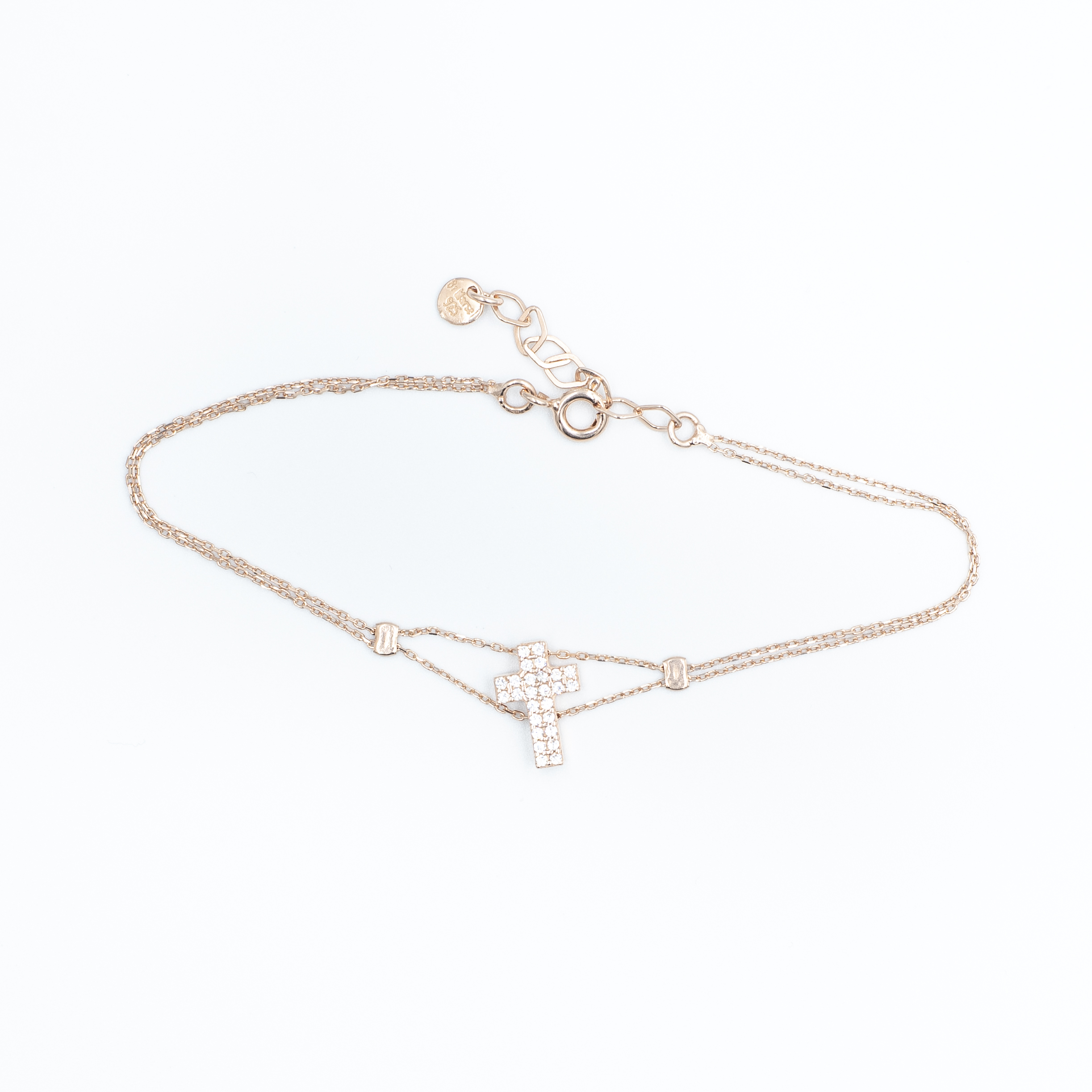 Βραχιόλι με σταυρό σε ροζ επιχρυσωμένο ασήμι 925 με λευκά ζιργκόν